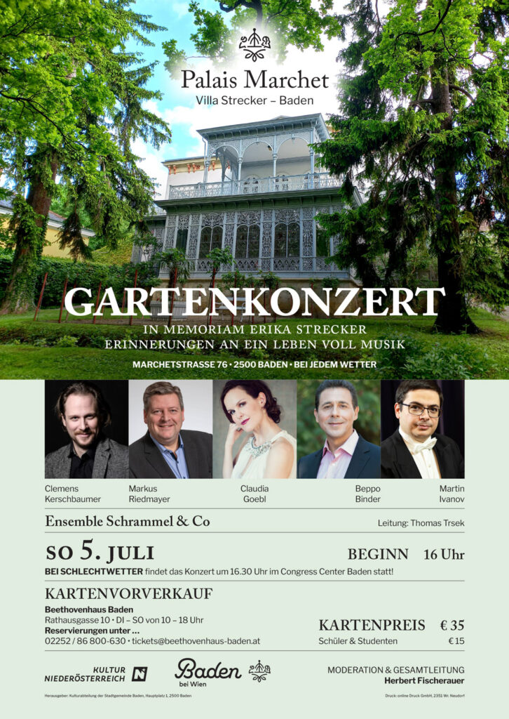 Am Sonntag, den 5. Juli 2026, findet um 16 Uhr das traditionelle Gartenkonzert im Park der Villa Strecker, dem neuen „Palais Marchet -Villa Strecker Baden“ statt.